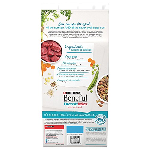 Give your small dog big flavor in every bite with Purina Beneful IncrediBites With Real Beef adult dry dog food, formulated specifically for small dogs. With real farm-raised beef as the number one ingredient this nutrient-rich blend helps support your small dog's higher metabolism. The easy-to-chew mini bite kibble are also created with your small dog in mind to cater to his tiny mouth and teeth. Accents of real carrots and peas add to the deliciousness of this tasty kibble for a flavor your dog will love. With 27 grams of protein in each cup, this premium dry dog food helps to maintain strong muscles. Feel good about filling his bowl, knowing that the 23 essential vitamins and minerals found in each serving aid in supporting his overall health and wellness. With savory flavor and high-quality ingredients, Purina Beneful IncrediBites With Real Beef adult dry dog food gives your little dog 100% complete and balanced nutrition.Feature