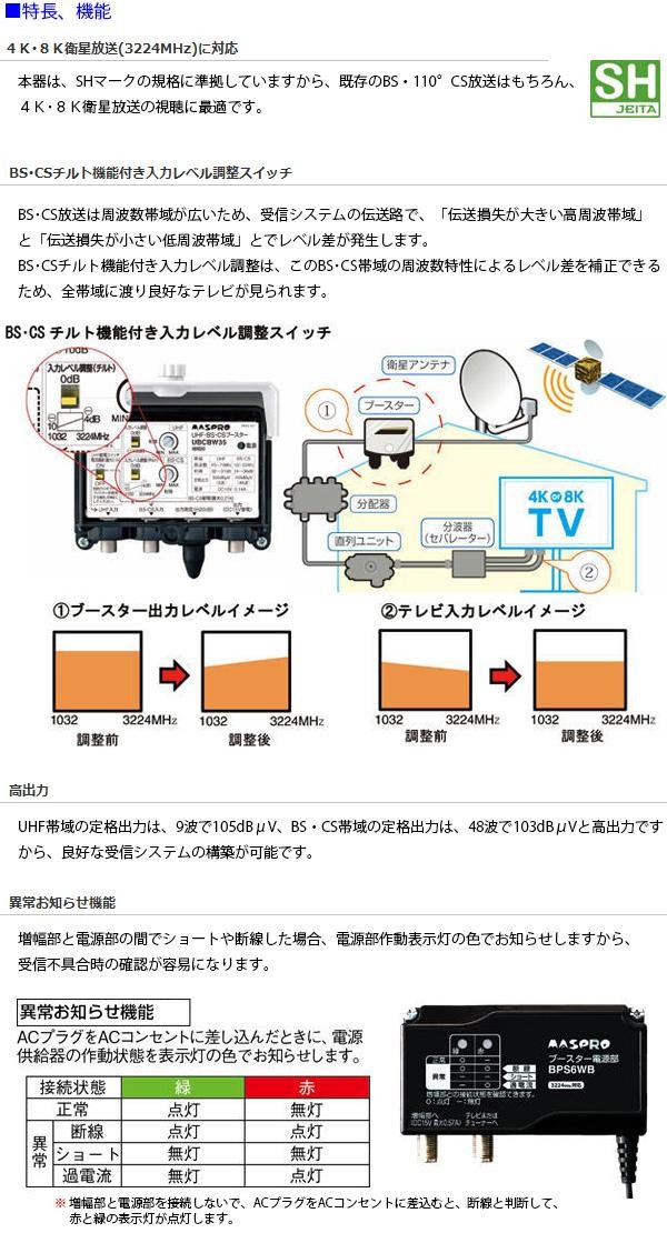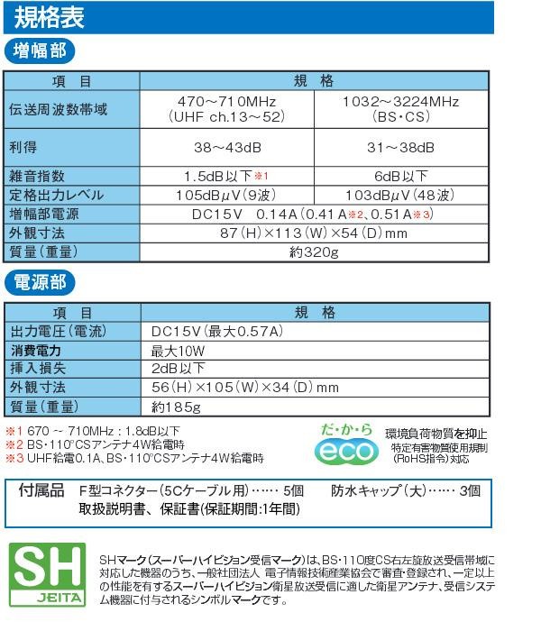 fk094igrjs現在放送されている地上波デジタル放送やBSデジタル放送などに加えて、4K・8K衛星放送(2224~3224MHz)の帯域も増幅します。 製造国:ベトナム 素材・材質:樹脂・アルミニウム 仕様:電源部ACコード長:約1m※お届け地域により、別途運賃がかかる場合やお届けできない場合がございますので、お問い合わせ下さい。