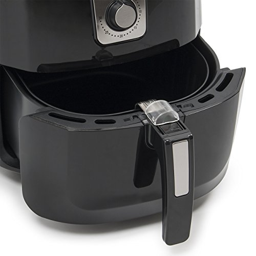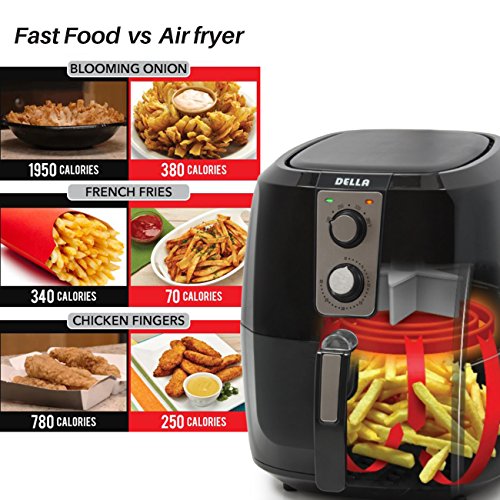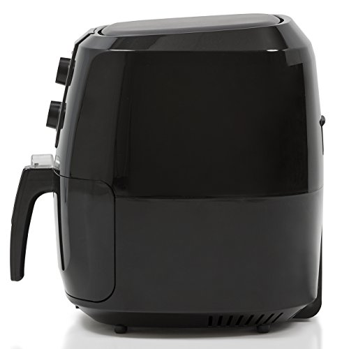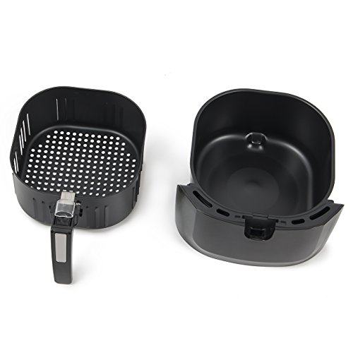 Air fryer has a 5.8-quart capacity allowing you to cook family sized portions worth of nuggets, tater tots, fries, and more. Enjoy your favorite snacks guilt-free! Latest Generation New model of electric Air Fryer allows you to enjoy your favorite fried snacks or foods without the added calories from dunking food in oil Fast cooking performance and very short preheating time enables you to prepare a meal for the whole family in record time! Fry with speed and precision for perfect results with less fat. 30 minute timer with automatic shut off and ready signal gives you a perfect fry every time! Powerful air frying technology with rapid hot air circulation system gives your food a crispy fried finish Enjoy delicious full flavor deep fried foods without the use of unhealthy fats and oils30 minute timer with automatic standby feature. The air fryer will automatically switch into standby mode when the cooking time is done. Features a ready light to let the user know when the air fryer has reached the desired temperature Adjustable temperature control from 180°F - 390°F allows you to prepare a variety of food from crispy fries to juicy wings with little to no oil at alit comes with a detachable basket for easy transfer from the fryer to a serving dish Protective plastic cover on food basket release button prevents accidental drop of the food basket holder No oil smell, no splatter, no mess Specifications: Color: Black Watt: 1800Voltage: 120v/60hzTimer: 0-30minTemperature Range: 180 to 390 degree Power Indicator: Yes Heating Indicator: Yes Fryer Pan Capacity: 5.8 Quart Detachable Basket: Yes Certification: ETL Listed Overall Dimension: 12"(W) x 14"(L) x 14-1/2"(H)Package Contents:1 x 1800W Electric Air Fryer1 x Manual/p.Feature