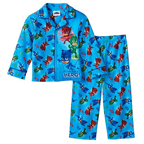 -. Binding : Apparel -. Brand : Pj Masks -. Color : Blue -. Department : boys -. Feature : 2-piece set includes: button-down top & pants / Top: button front, long sleeves / Pants: elastic waistband / "It's Time to be a Hero" quote / Polyester -. ProductGroup : Apparel -. ProductTypeName : SLEEPWEAR -. Title : PJ Masks Catboy, Gekko & Owlette Pajama Set Toddler Boy