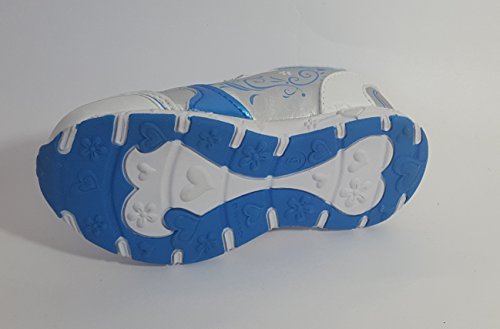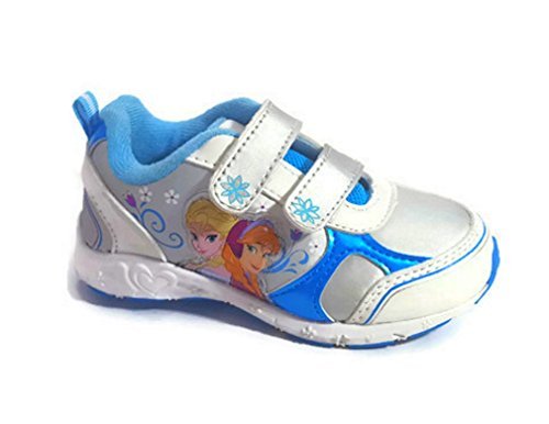 These cute shoes are easy to put on. The glossy synthetic leather upper features an iridescent silver design with pretty blue panels. Anna and Elsa images decorate one side.. A supportive rubber midsole and outsole offer arch and heel support for a comfortable day of play.