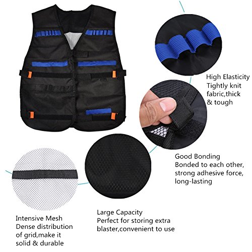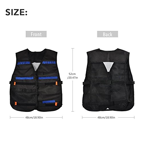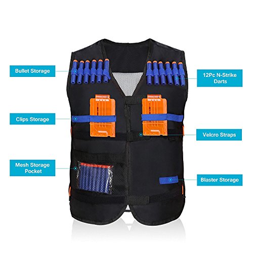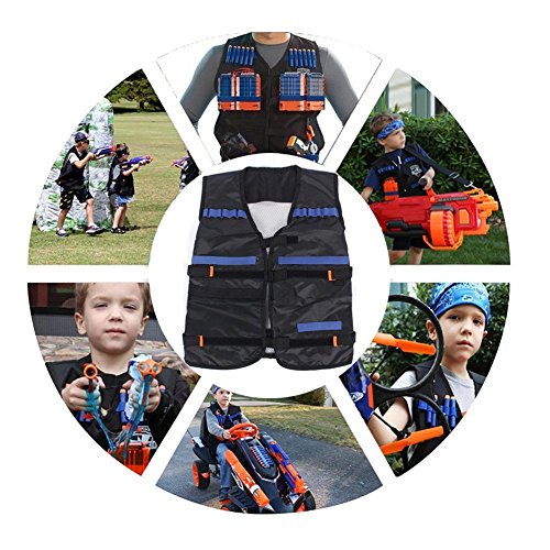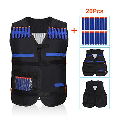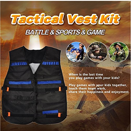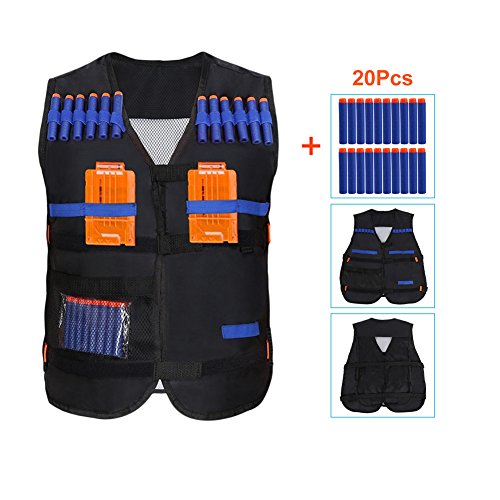 Studio : Yosoo Publisher : Yosoo Binding : Sports Product Description Options: Black:Just a Vest Camouflage:just a Vest Black Vest with 20 Pcs Soft Foam Darts Size: 15" x 14" x 3' (Approx.) Load up big-time for any N-Strike Elite mission with the Tactical Vest Kit! The vest's dart storage loops hold up to 12 darts, and you can fit 2 Quick Reload Clips in the clip storage area. There's a pocket for blaster storage so you can carry some backup firepower, and another pocket for whatever else you need to complete the mission! With all the ammo and firepower you can fit in your Tactical Vest and your blaster in your hand, you'll be ready for any battle situation! Packaging: 1 x Vest/Vest with 20 Pcs Soft Foam Darts 0