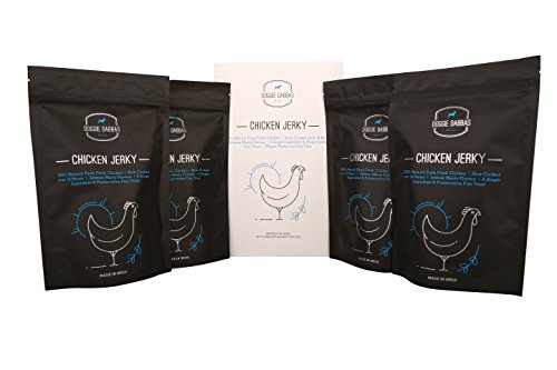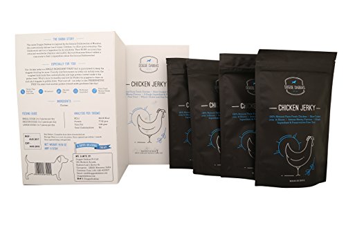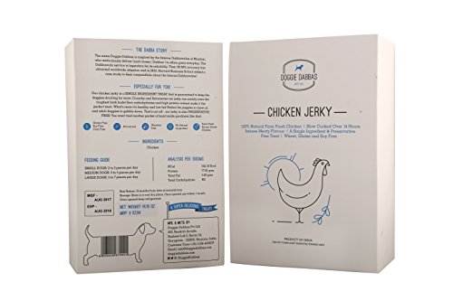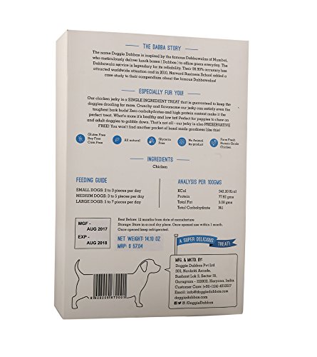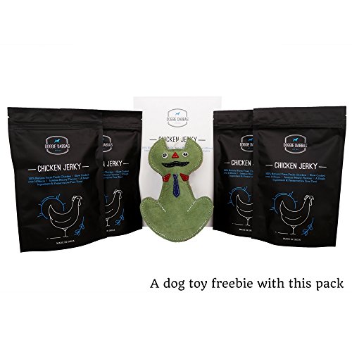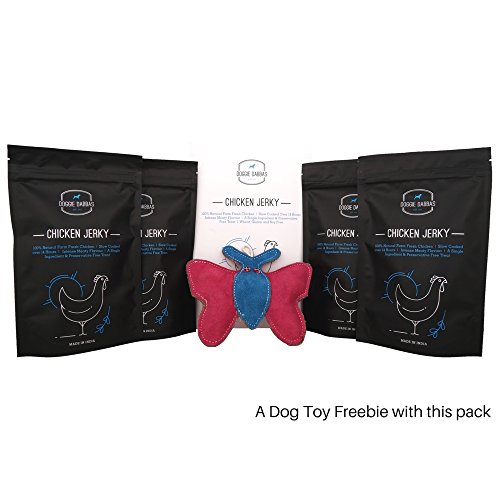 -. Binding : Misc. -. Brand : Doggie Dabbas -. EAN : 8908009672001 -. Feature : This preservative free chicken jerkey is made from 100 percent natural farm fresh chicken using a single ingredient. / Farm fresh chicken is slow cooked for over 14 hours to give an intense meaty flavour treat. Give your dog this treat to enhance motivation and reward the accomplishments. / Unlike artificially enhanced dog treats that leave a greasy, smelly residue on your hands, these feel and smell just like a delicious piece of chicken jerky. / Serve 2-3 pieces per day to a small dog | 3 to 5 pieces per day to a medium dog | 5 to 7 pieces per day to a large dog / In this pack: Get 14.1OZ (400GM) Farm Fresh Chicken Jerky packed in 4 packs of 3.5274 OZ (100gm) each. -. Label : DoggieDabbas -. Manufacturer : DoggieDabbas -. PackageQuantity : 1 -. ProductGroup : Pet Products -. ProductTypeName : PET_SUPPLIES -. Publisher : DoggieDabbas -. Studio : DoggieDabbas -. Title : Doggie Dabbas Chicken Jerky Dog Treat 14.1 OZ 100% Meaty Natural Farm Fresh Chicken (Pack of 4) - With A Complimentary Dog Toy