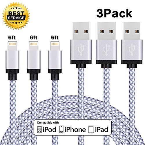 Omitech 3pcs 6ft Nylon Braided Charging Cable Charger 8-Pin Lightning to USB Cable Cord Compatible with iPhone 7/ 7 Plus/6/6s/6 plus/6s plus, iPhone 5/5s/5c,iPad, iPod and More(white)