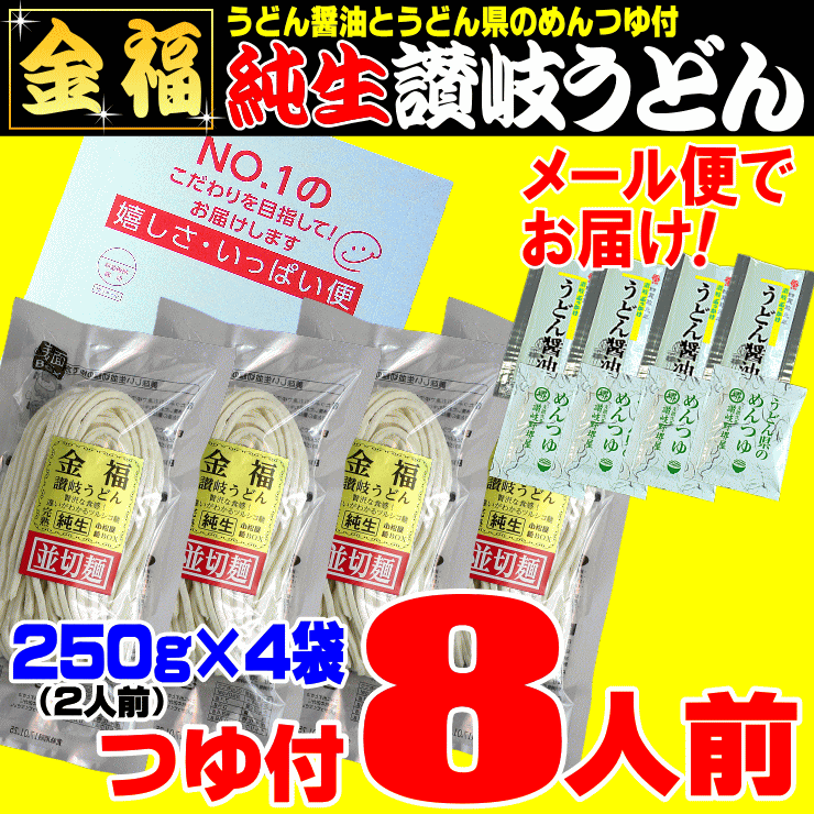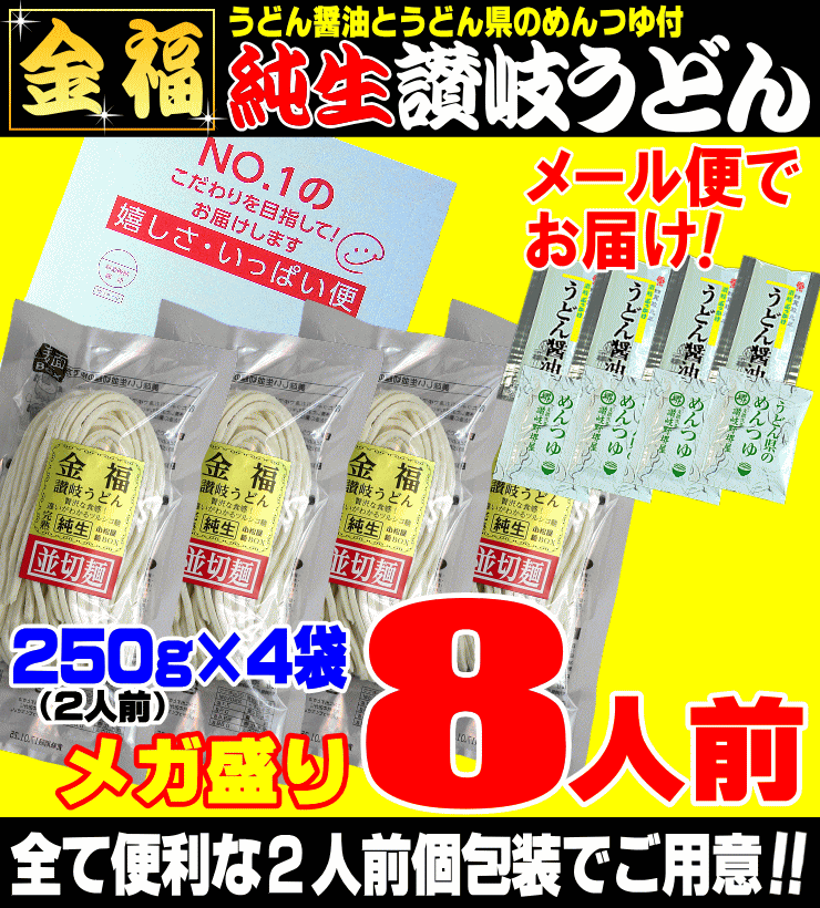 金福純生讃岐うどん 8人前つゆ付【1袋(250g)×4袋】合計1000g※1人前125g計算【賞味期限】 ページ上記表を参照【原材料名】 ページ上記表を参照▼※ご注文前に必ずご確認下さい※▼■他商品との同梱不可商品となります。■配送方法はゆうメール便のみとなります。■配達日時指定は出来ません。■代引き決済・後払い決済不可商品となります。■のしかけ、包装は出来ません。■発送後の注文内容の変更は不可のため、キャンセルはお受け出来ません。■送付先ご住所の変更も不可のため、お間違えの無いようお願い致します。■複数セットご購入の場合は、1セットずつの発送となります。■ご注文確定・決済完了後の2日~4日程で発送となります。■当店発送後4日~7日営業日前後の配達(土日祝は移動と配達休止)■ご自宅の郵便ポストに配達されます。※セール時など依頼が殺到した際は、発送が遅れることもございます、何卒ご了承下さいませ。※郵便局の配達員がご自宅の郵便ポストに入らないと判断した時、連絡票(または不在通知票)を入れて持ち戻る場合があります。