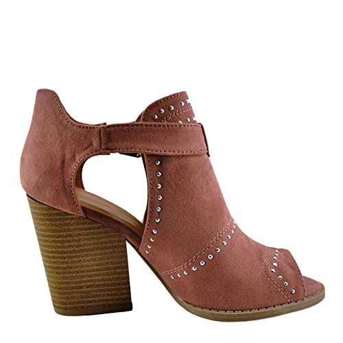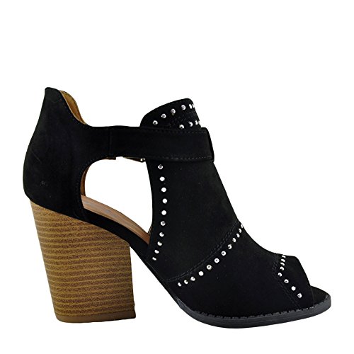 Binding : Apparel Product Description Add a little dazzle to your casual wear with this studded bootie called Barnes-170 by Qupid! Featuring, Soft faux suede upper, Trendy caged silhouette, Silver stud accents, Open-toe design, Buckle closure, Lightly cushioned insole for comfort, Chunky, stacked heel, Rubber sole with grip for traction. 0