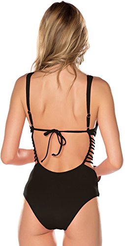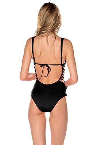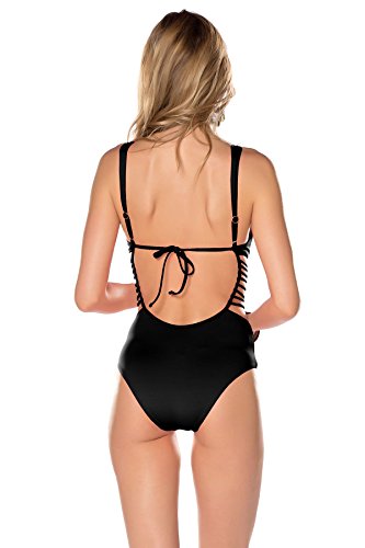 Product DescriptionOne piece plunge with removable soft cups, adjustable straps, and handwoven macrame. Ties at back.0