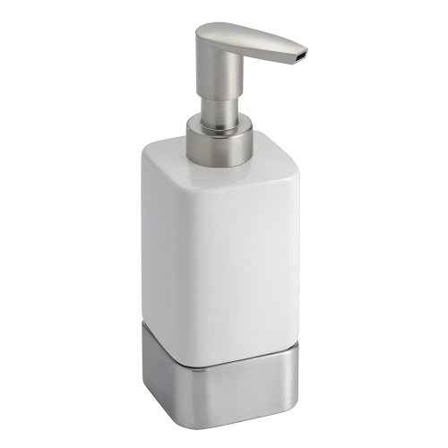 - Made of ceramic; brushed stainless steel accents with plastic pump head