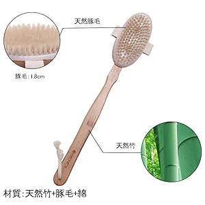 材質:天然竹(柄)+豚毛(ブラシ)+ナイロン+綿(紐)