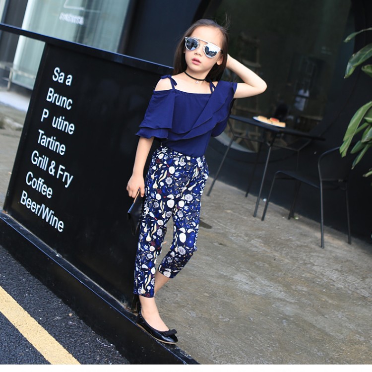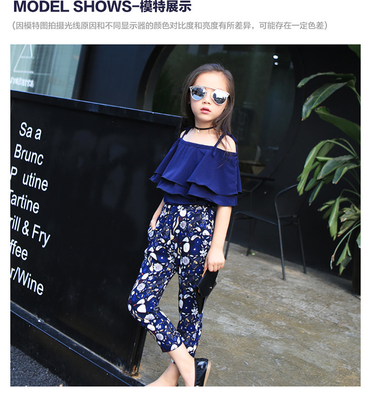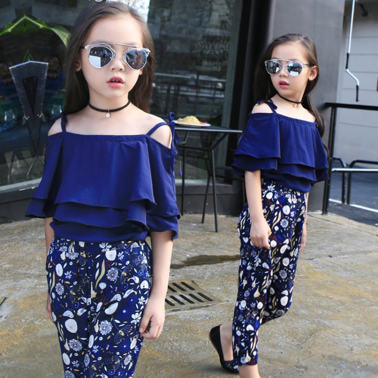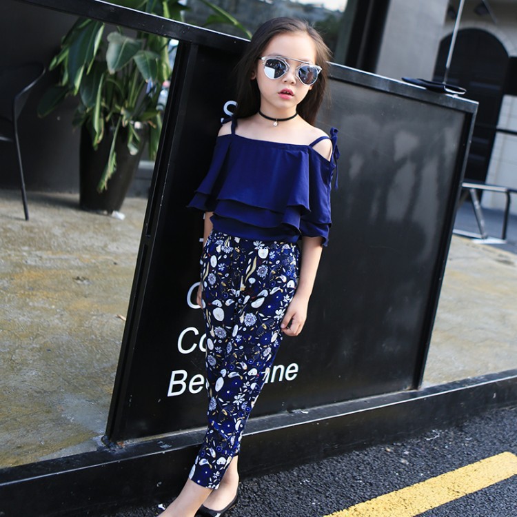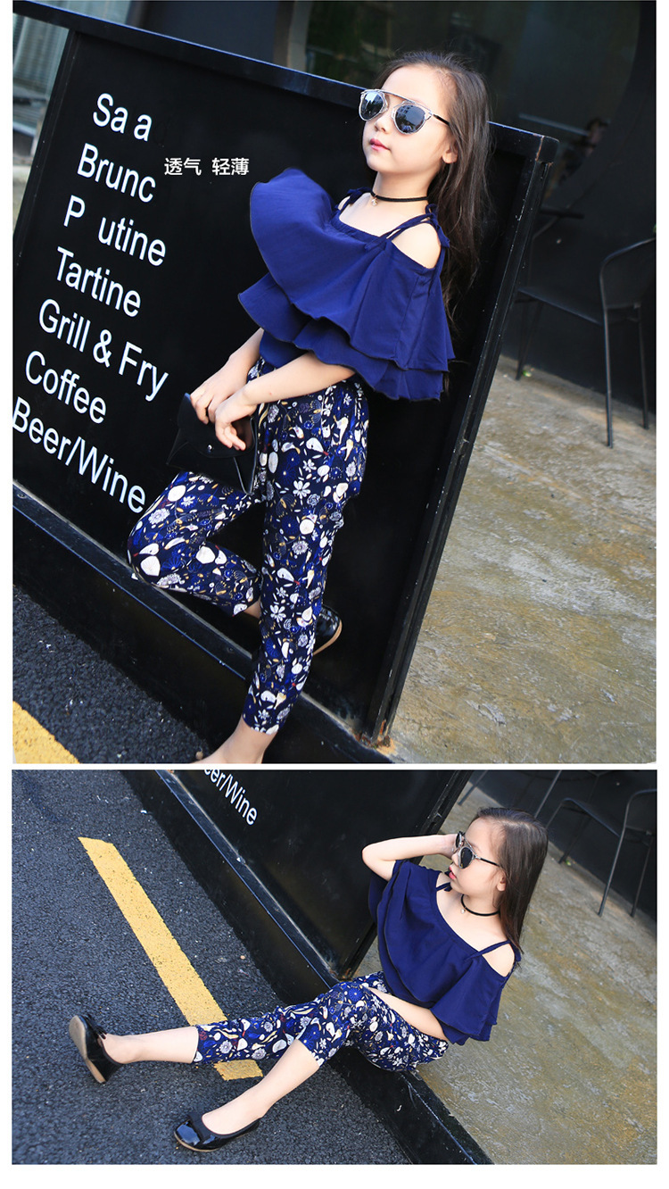 童装女童套装夏季新款中大童韩版潮童露肩T恤裤子雪纺两件套