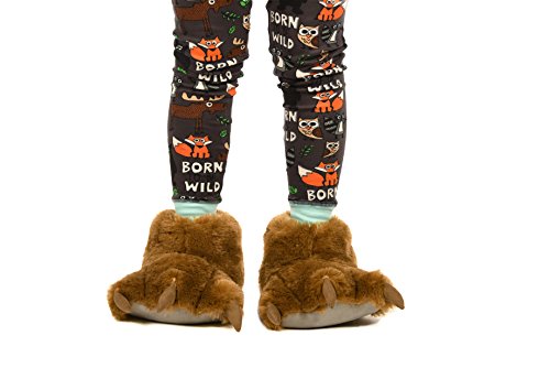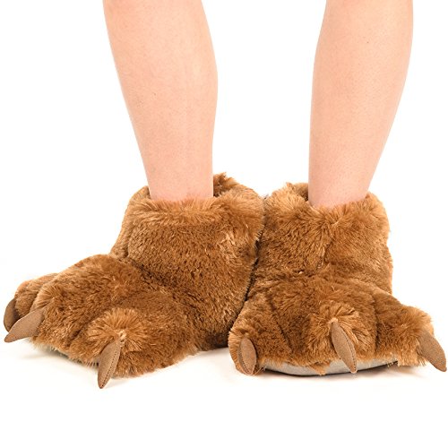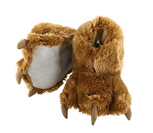 Product Description If you're on the prowl for cushy comfort, our Wolf Paw Slippers are really something to howl about! And since funny animal slippers are for young pups and old dogs alike, we've got paws for the whole pack. Thick fur in variegated shades of brown, cushioned with a fleecy interior, defies even the coldest of floors. Accented with creamy, fuzzy toes and formidable claws, it's easy to see why wolf slippers dominate! 0