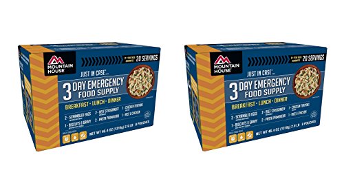 Now you can easily customize an emergency food supply with Mountain House Just in Case. emergency food supply multi-day kits. Are you looking for a 7-day supply? Combine our 3-day and 4-day emergency food supply kits. Customize your emergency food supply foundation to fit your taste preferences and budget. This stackable 3-day boxed kit contains a variety of popular breakfast, lunch and dinner entrees for one person. Includes 9 total pouches: Eggs & Bacon (2) - The comforting taste and smell of crispy, crumbly bacon combined with scrambled eggs. Biscuits & Gravy (1) - Hot fluffy buttermilk biscuits with creamy pork sausage gravy make for a hearty, family-favorite. Beef Stroganoff (2) - Tender beef, noodles, and mushrooms smothered in a rich sour cream sauce. Pasta Primavera (2) - Zucchini, spiral macaroni, cauliflower, broccoli, red & yellow peppers and green beans in a creamy, parmesan cheese sauce. Rice & Chicken (1) - Rice and chicken in a savory sauce accented with pimientos. Chicken Teriyaki (1) - Chicken, rice, mushrooms, bamboo shoots and vegetables with a sweet and tangy oriental sauce.Feature