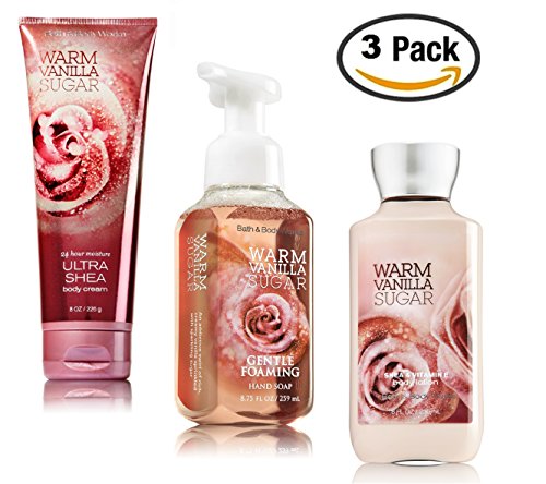 -. Feature : Warm Vanilla Sugar Bath and Body Works Gift Set - from the best selling signature collection. / Indulge in an addictive swirl of rich, creamy vanilla sP.R.Inkled with sparkling sugar. / You receive THREE (3) items in all - one Ultra Shea Triple Moisture Cream (8 oz), one Body Lotion (8 oz) and one Gentle Foaming Soap (8.75 oz) -- $34 Retail Value! / Wash your way to softer, cleaner hands with a cloud of luxurious foam that transforms into a rich, creamy lather to gently wash away dirt and germs. Follow with America's #1 body lotion -- a fast absorbing formula infused with Shea Butter and protective Vitamin E that provides 16 hours of continuous moisture. / At night, use the Ultra Shea Triple Moisture Cream with soothing Aloe Butter, pampering Cocoa Butter and more Shea than ever before -- this non-greasy formula melts into skin to provide beautiful fragrance and all day, all night hydration.