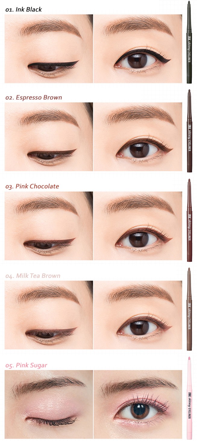 Skinny pencil eyeliner with various color spectrum. The soft cream gel