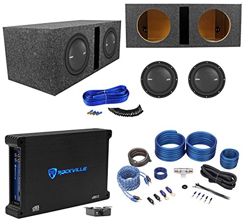 -. Feature : Package Includes: (2) Polk Audio MM1042SVC 10" Single 4-Ohm Car or Marine Subwoofers Totaling 2400 Watt + Rockville dB13 3000 Watt Peak 1500 Watt RMS Mono Class D Car Amplifier + Rockville RWK41 4 Gauge 2 Channel Complete Wire Kit With RCA Cables + Rockville RDV10 Dual 10" 1.1 Cu. Ft. Vented Subwoofer Enclosure + Dual Enclosure Wire Kit With 14 Gauge Speaker Wire + Screws + Spade Terminals / Polk Audio MM1042SVC 10" 1200 Watt Single 4-Ohm Car/Marine Audio Subwoofer Sub. Driver Compliment: 10" (254mm). Cutout Dimensions: 9" (230mm). Mounting Height: 0.55" (14.06mm). Mounting Depth (Top): 4.6" (115mm). Mounting Depth (Bottom): 5" (129mm). Peak Power Handling: 1200 Watts. Continuous Power Handling: 400 Watts. Nominal Impedance: 4 Ohms. Frequency Response: 28Hz-200kHz. Sensitivity: 86 dB. Magnet Weight: 54.4 oz. / Rockville dB13 3000 Watt/1500w RMS Mono Class D 2 Ohm Amplifier. CEA Compliant Power Ratings . 2 Ohm: 750 Watts x 1 Channel <1% THD+N. 4 Ohm: 450 Watts x 1 Channel <1% THD+N. RMS Power Ratings: . 2 Ohm: 1500 Watts x 1 Channel. 4 Ohm: 900 Watts x 1 Channel. Peak:. 2 Ohm: 3000 Watts x 1 Channel. 4 Ohm: 1800 Watts x 1 Channel. High-Speed MOSFET Power Supply. Optical Coupler Class "D" Technology. / 1 - 17' High Grade Twisted Pair of 100% Copper RCA Cable. 17' - 4 Gauge Translucent Blue SuperFlex Power Cables. 17' - 18 Gauge Blue Remote Cable. 17' - 16 Gauge Clear Speaker Wire. 3' - 4 Gauge Clear SuperFlex Ground Wire. Gold Plated AGU Heat Resistant Fuse Holder. 60 Amp AGU Gold Plated Fuse. 7' Split Tube Loom. Accessories Included: Wire Ties, Ring Terminals, Butt Connectors, Spades, and Grommets. / Rockville RDV10 Dual 10" Vented Subwoofer Enclosure. Proudly Made In The USA, Using Only The Finest Quality Materials - For The Best Level of Performance From Your Subs!. 3/4" USA Heavy Duty MDF Construction. Machine precision cut mounting holes. Top of the line Glue for extra durable adhesion. High quality GOLD spring loaded terminals. Designed, tested, and engineered to work with most of today's popular woofers.