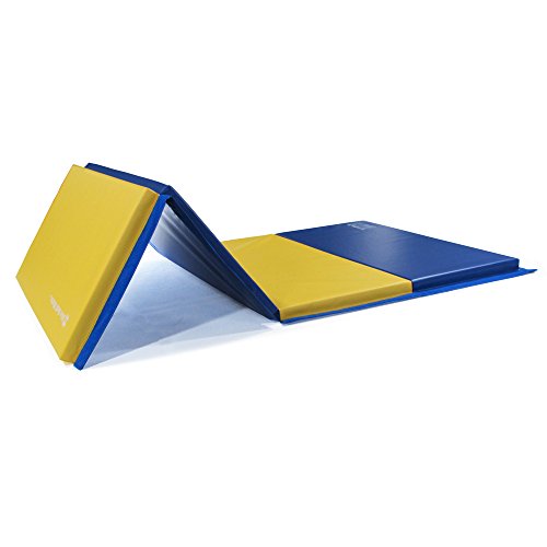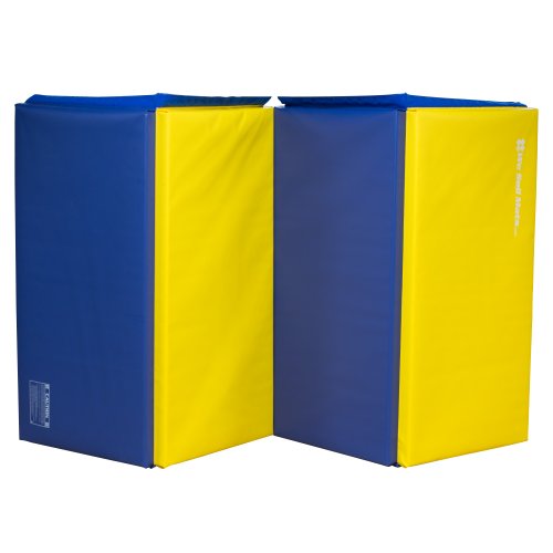 We Sell Mats GM4x8YWBLv4-35M Yellow / Blue 1.5" Thick Gymnastics Tumbling Exercise Folding Martial Arts Mats with Hook & Loop Fasteners On 4 Sides Crosslink PE Foam Core
