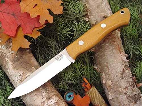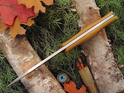 - 9 3/8 overall. 4 1/2 cpm-3v stainless blade. Full tang. Natural Canvas Micarta handles. Lanyard Hole. Embossed brown leather belt sheath