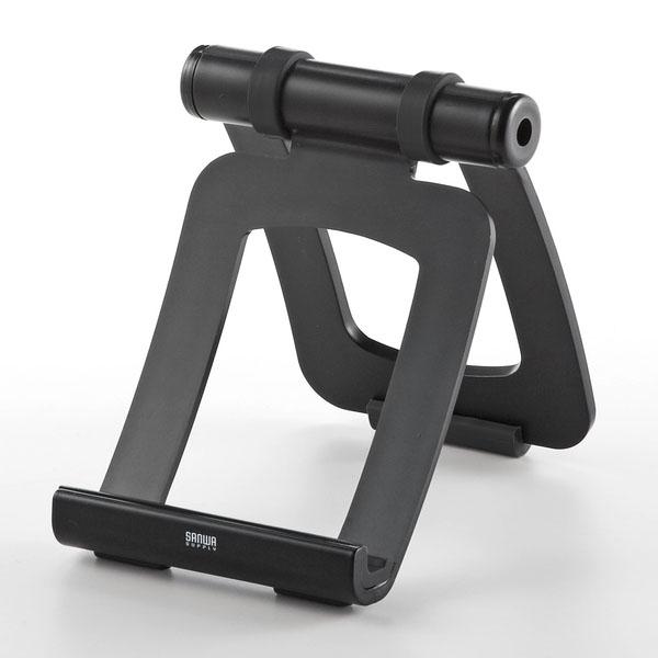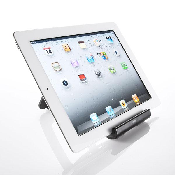 | iPad、iPad2をはじめとする、9~12インチ程度のタブレットPC、スレートPC、電子書籍端末などを立てかけて作業することができます。フレームを開くことで角度調整が簡単にできます。フレーム、台座部に滑り止めが付いているので、タッチパッド使用時も本体がずれることなく快適に操作できます。縦置き、横置きどちらの設置にも対応しています。折りたたむことができ、持ち運びに便利です。 |