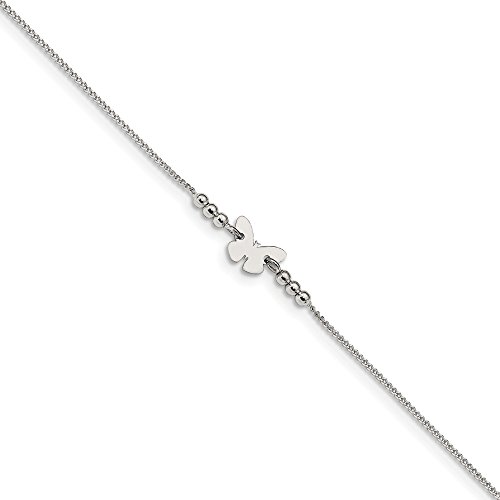 Anklets are a great way to add fun, flash and a feminine touch. This polished station design made from sterling silver features a 1mm width solid link curb chain, 2mm width beads and a 7 x 10mm flat butterfly link station. It is adjustable in length from 9 to 10 inches and closes with a spring ring clasp.Feature