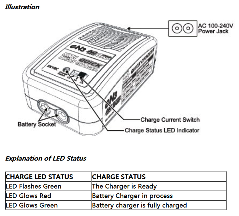 SKYRC eN3 NiMH/NiCad charger is an economic, high quality 100-240V AC charger, designed for charging NiMH and NiCad batteries from 4-8 cells. The circuit power is 20W and max charge current can reach to 3A. There are four kinds of charge current 1A/2A/3A that can be selected. You could select the proper charge current according to battery capacity.