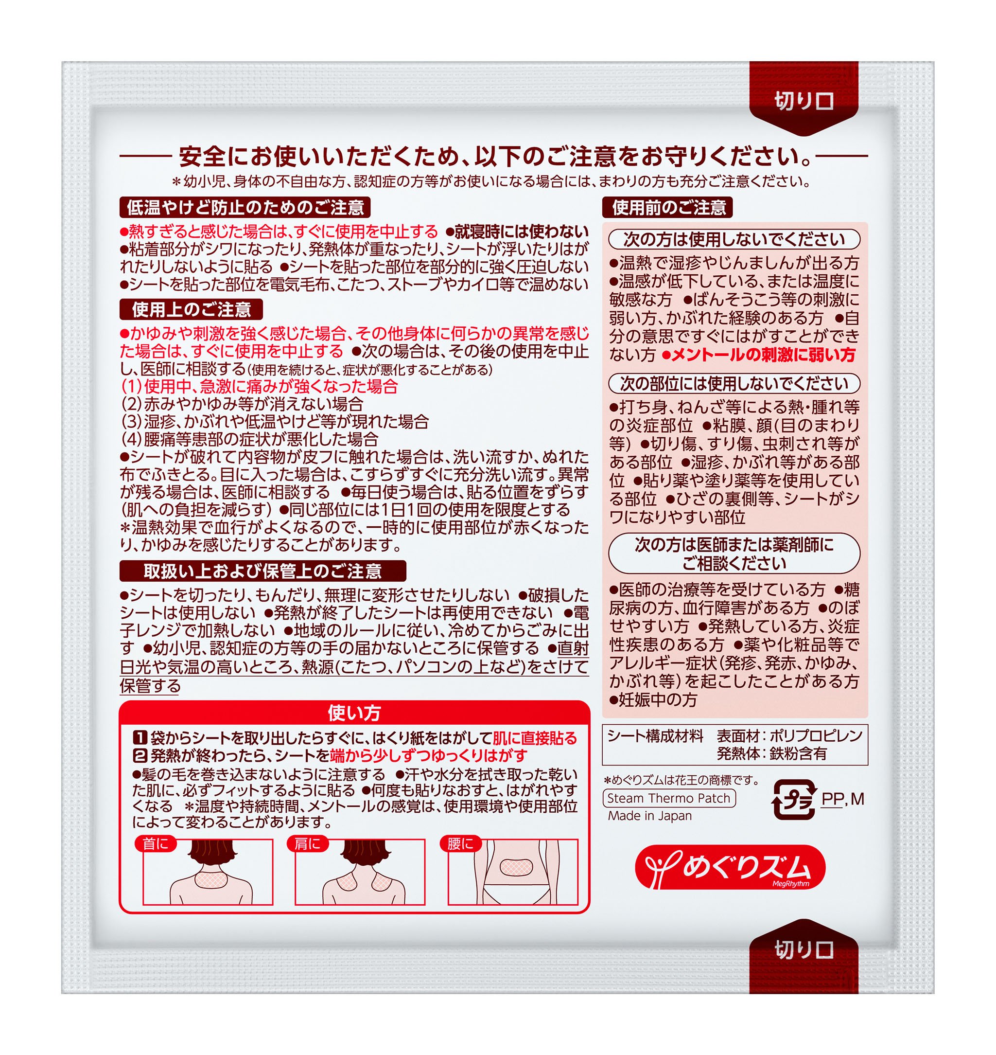 Before use Please do not use the next person ● Those who get eczema and urticaria with heat ● The feeling of warmth is reduced or sensitive to temperature ● Those who are vulnerable to irritation such as steroids, people with irritated experiences