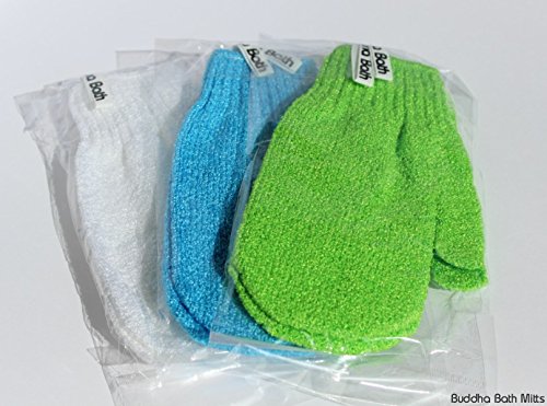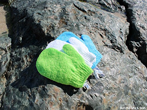 Buddha Bath Scrub Gloves - 3 pairs of exfoliating shower mitts - Washable - Hang Rope - Full body use