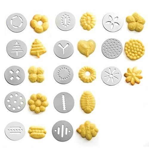 The cookie press kit includes:1 cookie press,13 cookie press discs and 8 icing tips,elegant storage plastic box.