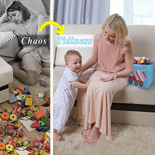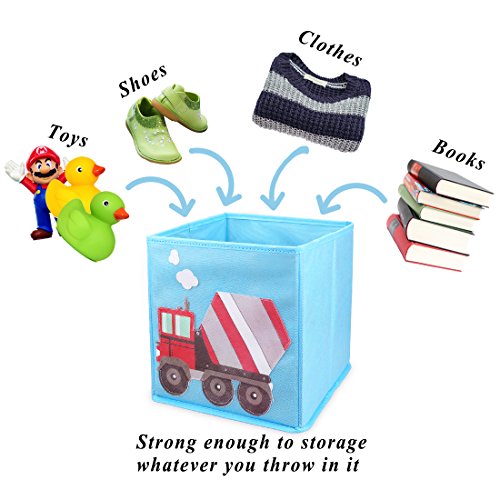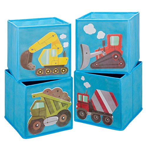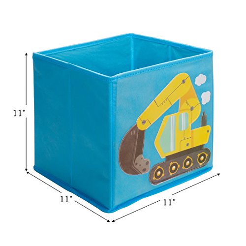 Studio : Bundle Monster Publisher : Bundle Monster Binding : Toy Product Description Add some color and fun to your child's bedroom, nursery, or playroom! Ava King's light blue construction-themed cube storage bins fit perfectly in most cubical shelves. This set of 4 foldable fabric containers features brightly colored cut-out construction vehicles including bulldozer, cement mixer, dump truck, and excavator. The white outline and stitching allow these cute vehicles a playful crafty pop that your child will love. These storage cubes allow you to pile odd-shaped belongings inside all the way to the top, maximizing your storage space. Your child's room will instantly feel less cluttered and a lot more organized with these fabric storage cubes. When not in use, each storage container is foldable/collapsible, so it won't take up space. These fabric drawers for cubes are soft and look great in children's bedrooms, nurseries, or play rooms. Materials: Non-woven polypropylene fabric chipboard wall reinforcements; Interior Dimensions: 10.25in x 10.25in x 10.25in; Exterior Dimensions: 11in x 10.5in x 10.5in (HxWxL). Perfect for: -books -toys -clothes -shoes -art supplies -school supplies -other knick-knacks **NOTE**: Due to differences between monitor displays, actual color may vary slightly from image. Ava Kings is a registered trademark of Remi Collections LLC and is exclusively distributed by Bundle Monster. Ava Kings trademark is protected by US Trademark Law. 0