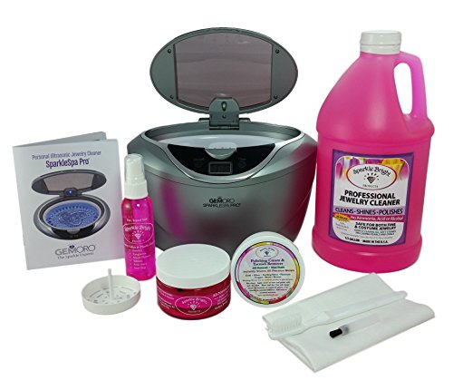 KIT INCLUDES: a Gemoro Sparklespa Pro Ultrasonic Cleaner (Gray Slate color) lift-out tray, watch stand, instructions for use, Half Gallon Liquid, 4oz. Liquid with lift-out tray and detail brush, 2oz. Liquid Spray, 2oz. Polishing Cream and Tarnish Remover, 100% Cotton Flannel Drying/Polishing Cloth, and Soft Toothbrush.