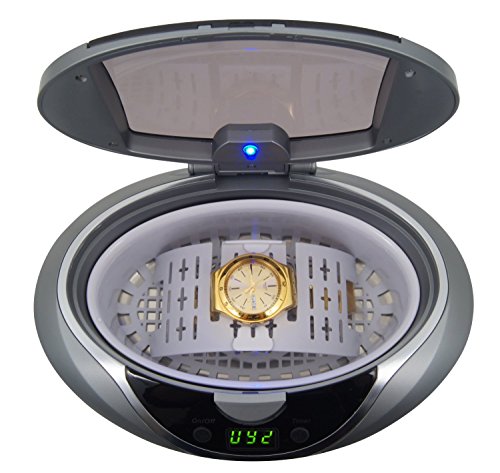Safely cleans most jewelry using regular tap water | Bright blue LED illuminated stainless steel tank | Auto-opening transparent evaporation-free cover | Quiet solid-state circuitry | Elegant European contoured design with chrome accents | Removable basket and bracelet / watch holder included; 50 / 60Hz | 1 Year limited replacement warranty