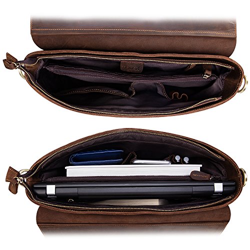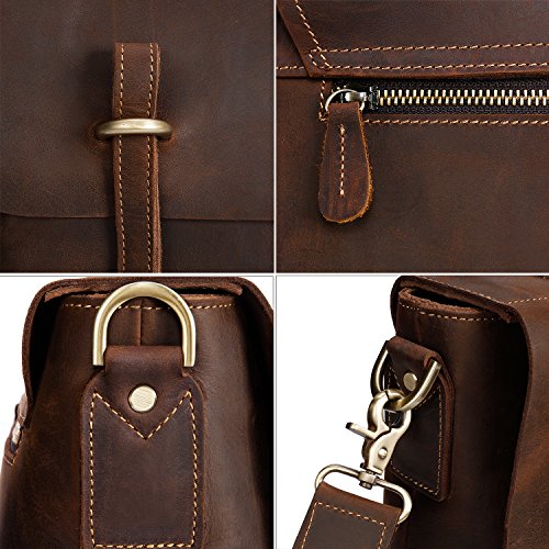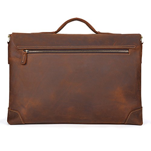 -. Feature : 100% brand new & High quality / Made of top layer Crazy Horse genuine cow leather, with bronze tone hardware / Inside is nicely lined with durable fabric, which fits 15" Laptop, has 1 wall zippered pocket, 2 additional pockets, cell phone holder and wallet holder; Back exterior with zipper pocket / Removable, adjustable, thicken and padded shoulder strap with a length up to 55 inches / This vintage style messenger bag is perfect for using in business, college or other casual occasions