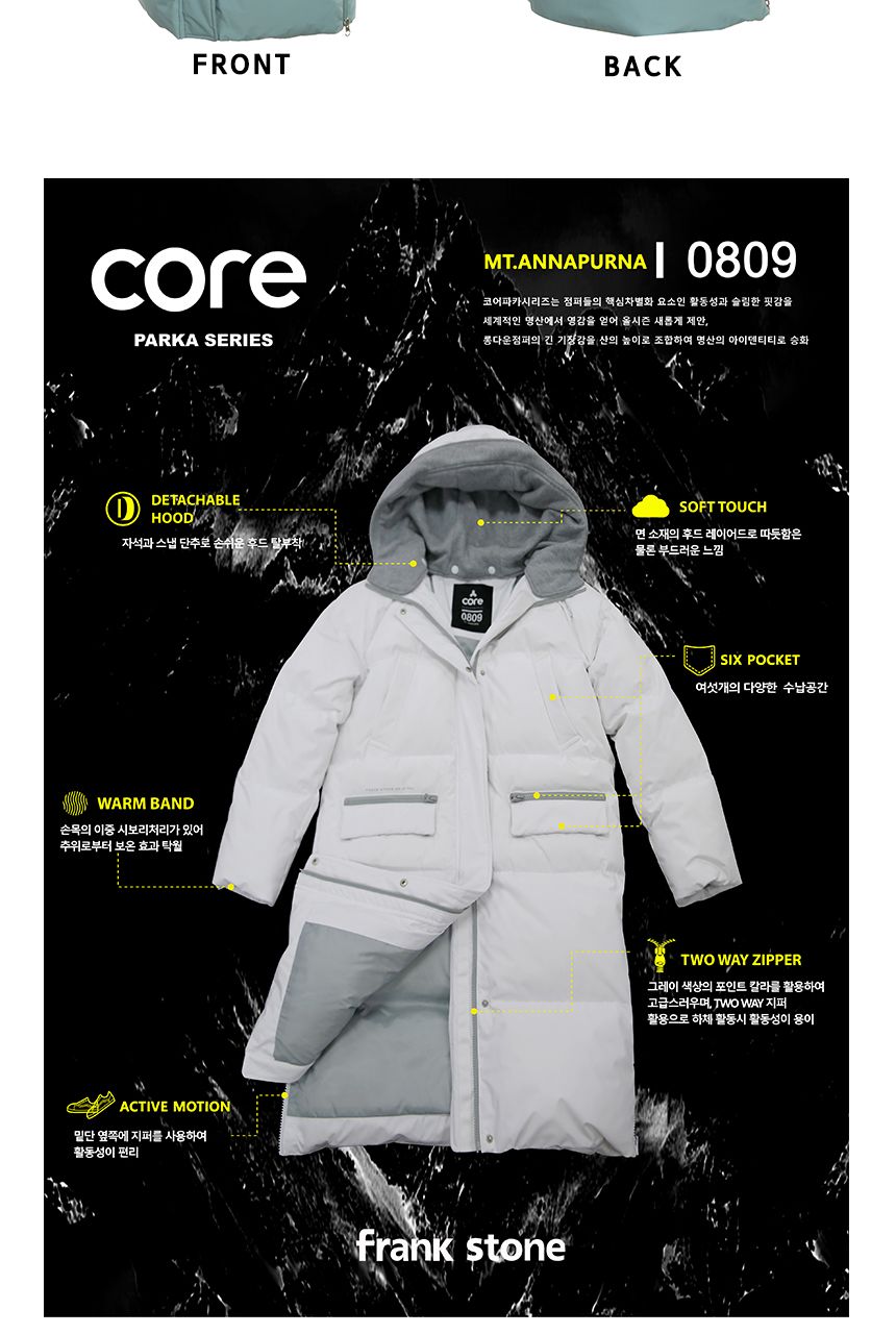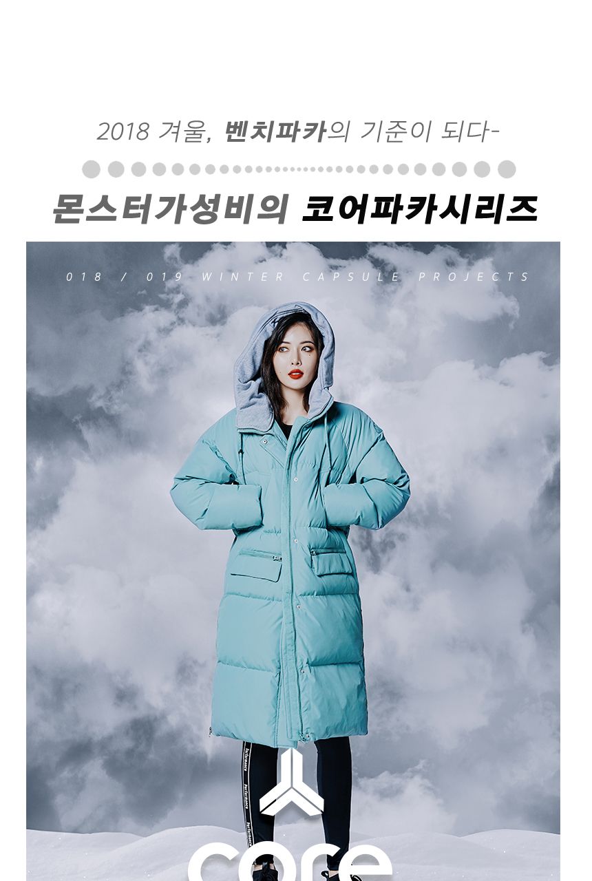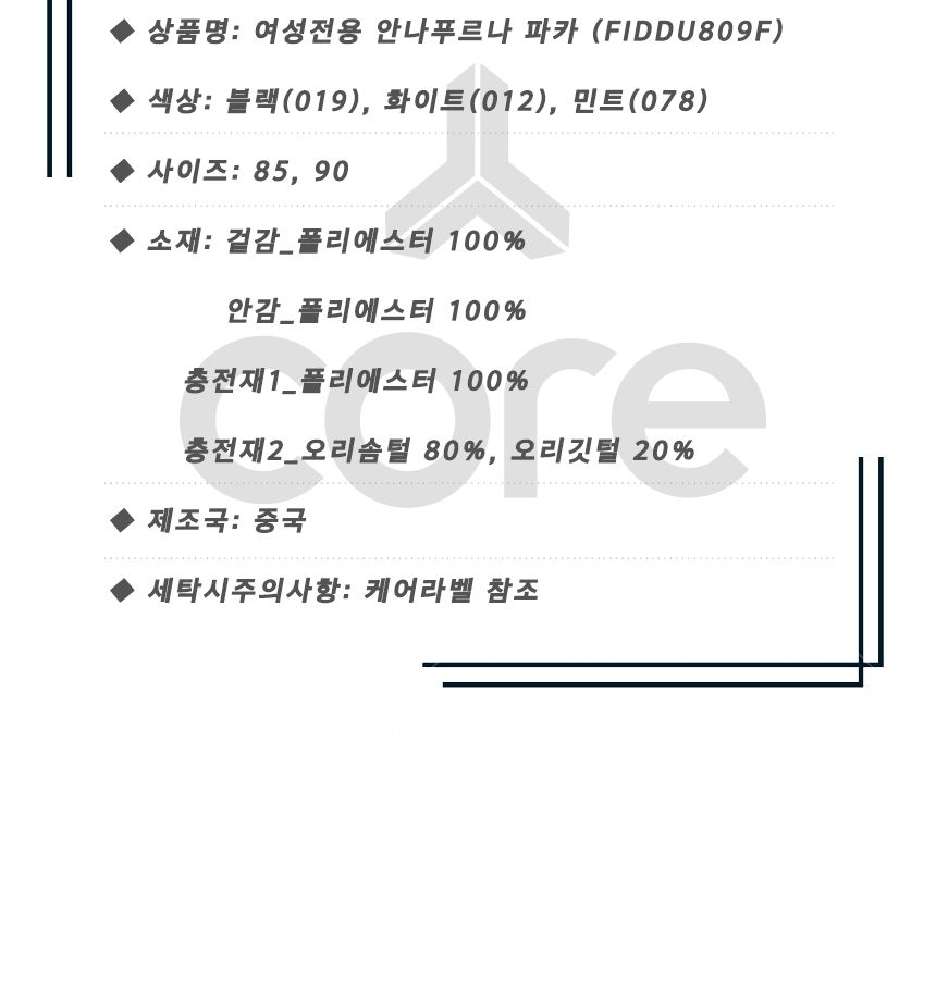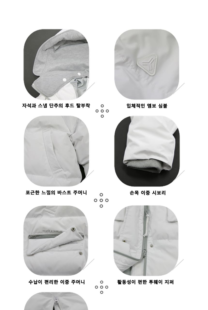 소재 겉감:폴리에스터100% 안감:폴리에스터100% 충전재1:오리솜털80%오리깃털20% 충전재2(후드):폴리에스터100%