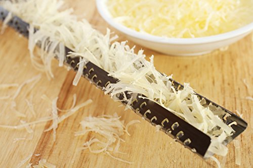 - 【SIMPLE TO USE AND EASY TO CLEAN】Make the hardest cheese into grated fluff using virtually no pressure. Simply zip the cutter-knife across the rinds of oranges, lemons and limes. You can have finely rasp almost anything, including nutmeg, coconut, ginger, vegetables like carrots, garlic or potatoes. To clean, simply rinse under warm water and lightly tap it on the side of your sink to help loosen or dislodge any particles. Then, just allow it to air dry. It's also dishwasher-safe!