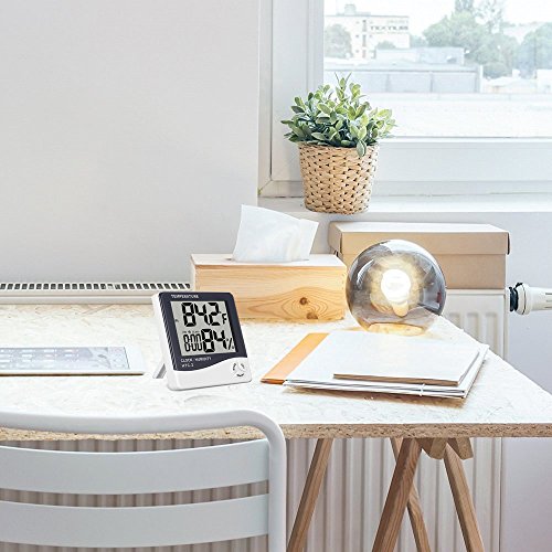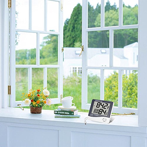 -. Feature : ★Dual Temperature Meter - Detect the indoor temp and outdoor temp with 5 foot external probe line, just place it beside the window and leave the probe outside the room, know the separate temperatures with ease. / ★Measure Precise Indoor Humidity - Tell you real-time relative humidity in room, proactively prevent the health issues associated with the dry or too wet air. / ★Big LCD Screen - Display the indoor or outdoor thermometer/ relative humidity/ time/ alarm time/ date on the large LCD screen ,easy to read even in a distance. / ★Simple Opeation - Press button °C/°F to switch from °C to °F; Press OUT/IN to display outdoor temp or indoor temp; Press MEMORY to display max/ min temp and humidity; Press MODE and ADJ to display clock/ alarm time/ date and adjust datas. / ★Measure Range - Temperature range: outdoor: -58℉ to +158℉, indoor range: -14℉ to +122℉; Humidity range: 10% to 99% RH. Product require 1 pcs AAA battery. (Not included)