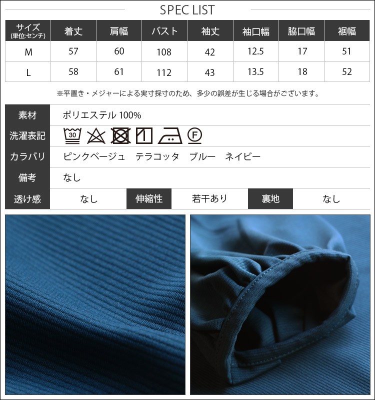 M:着丈 57cm 肩幅 60cm バスト 108cm 袖丈 42cm 袖口幅 12.5cm 脇口幅 17cm 裾幅 51cm