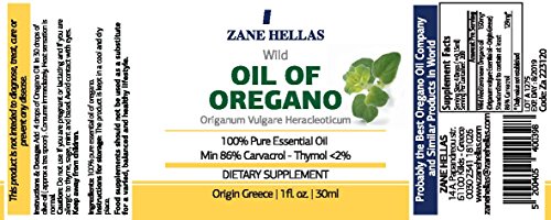 -. Feature : 100% Pure Essential Oil of Oregano .UNDILUTED. Delivery within 8-9 working days / MINIMUM 86% CARVACROL. Certificate of chemical analysis comes with your order. / Provides Carvacrol per serving 129 mg. Less than 2% Thymol. 100% Steam Distilled. No chemicals. Alcohol free. / 100% Wild and Organic.ZANE HELLAS is Probably The Best Oregano Oil Company and Similar Products In World. / Oregano is a perennial plant that grows in many parts of the world. It is an aromatic plant with healing properties known since ancient times. There are many published scientific studies on the properties and effectiveness of Oregano Oil - Carvacrol. Main features of Oregano is that it has excellent anti-fungal properties. The Mediterranean is the synonym of Greece and Greece is synonymous to Mediterranean. Perhaps the best Oregano in the world grows in Greece and it is known worldwide as the Greek Oregano. The climatic conditions of Greece, the sunshine, the sea breeze, and the subsoil rich in trace are these that make the Greek Oregano the best in the world. From this oregano, wild from the Greek mountains and organic (non GMO ) we make the essential Oil of Oregano that we offer. From the best oregano in the world we produce perhaps the best Oregano Oil in the world. Oreganum Vulgare Heracleoticum-Hitrum is the variety. 100% Pure Essential Oil of Oregano. Less than < 2% Thymol (Thymol is toxic in high concentrations). Certification analysis of the product shipped with your order. Analyze and certify each production batch. Pipette dropper cap, dark amber glass bottle.