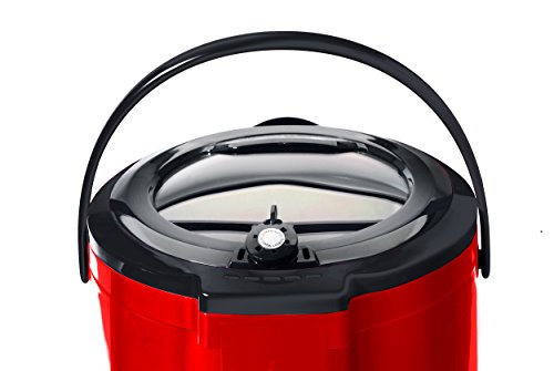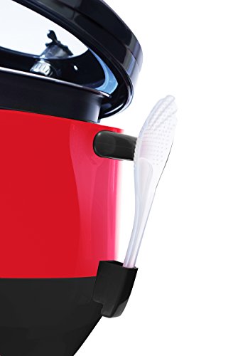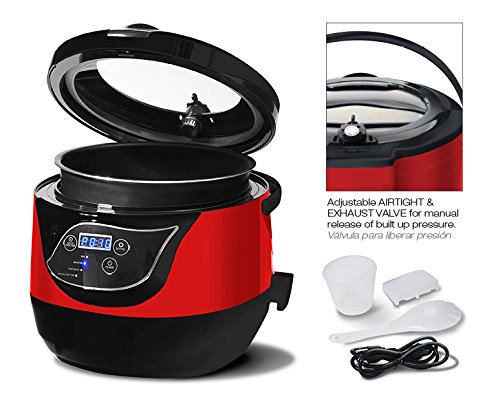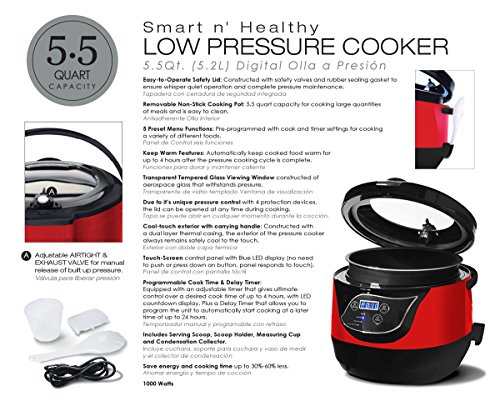 Uses 35-60% less energy and reduces cooking times significantly. Unlike other pressure cookers due to the unique pressure control system with 8 protection devices, the lid can be opened at any time during cooking. 5.5 quarts, nonstick inner pot, 24 hr. delay timer with memory function, 5 preprogrammed menu functions for rice, meat/fish, vegetables and keep warm for up to 4 hours. Also has ability to cook rice like a standard rice cooker. Includes Serving Scoop, Scoop Holder, Measuring Cup, and Condensation Collector. Transparent tempered glass viewing window constructed of aerospace glass that withstands pressure. 1000 watts.Feature
