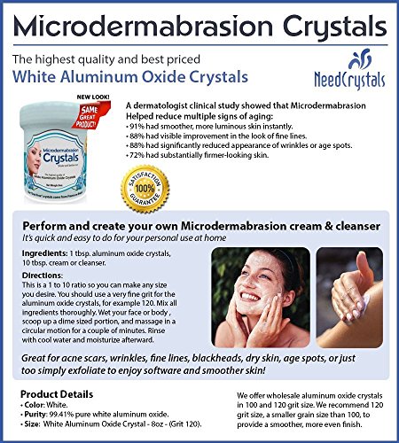 -. Binding : Health and Beauty -. Brand : NeedCrystals -. Feature : Highest Quality Aluminum Oxide Microdermabrasion Crystals Ultimate Skin Treatment: Is your skin ready for a powerful makeover? Turn your home into a spa and get softer, brighter, younger-looking skin instantly. Reduce the appearance of fine lines and wrinkles, sun spots, age spots, acne scars and pores. Get the great skin you've always wanted with easy blackhead removal solutions from NeedCrystals. / INCREDIBLE RESULTS: NeedCrystals microdermabrasion crystals gently exfoliate the skin to reveal a radiant new you. Thanks to its anti-aging and skin-improving properties, skin is totally rejuvenated and looks smooth, fresh and bright. In fact, reviewers rank NeedCrystals in the top 5 with comments like: "Skin feels like silk." "The results are instantaneous." "Amazing!" Gives "that youthful glow we all want." Try NeedCrystals and see the incredible results for yourself! / HIGH-QUALITY CRYSTALS: These beautiful, pure microdermabrasion crystals from Brazil and France contain nothing but corundum. Not only are they an effective, pharmaceutical-grade treatment for more beautiful skin, they are surprisingly gentle as they polish away dead skin cells and reveal a smoother, brighter you. / RISK FREE: We really think you'll love what our microdermabrasion crystals do for you and your skin, but if for any reason you don't agree, it's okay. NeedCrystals believes in results and great-looking skin - not in risk or hassle. Simply contact us for a full refund or product replacement. Please refer to the Amazon Return Policy. / Facial-Microdermabrasion-Products - Reduces Appearance Of Acne Scars, Blackheads, Wrinkles, And Stretch Marks. -. Label : NeedCrystals -. Manufacturer : NeedCrystals -. MPN : WAO120 -. PartNumber : WAO120 -. ProductGroup : Beauty -. ProductTypeName : BEAUTY -. Publisher : NeedCrystals -. Studio : NeedCrystals -. Title : NeedCrystals Microdermabrasion Crystals Professional Exfoliating Facial Skin Care. White Aluminum Oxide