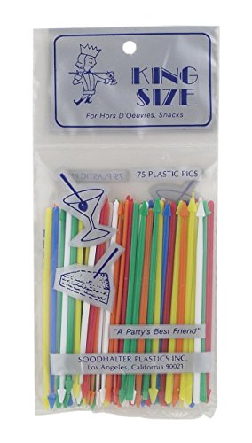 Studio : Soodhalter Plastics Inc. Publisher : Soodhalter Plastics Inc. Binding : Kitchen Product Description Soodhalter king-size food pics are perfect for creating festive party foods, firmly securing assembled foods, and building decorative garnishes. Add a splash of Color while holding together wraps or stacked sandwiches, finish delicious cocktails with colorful fruit picks, or create convenient handles for serving party foods on passed platters. The arrow-shaped end easily grabs olives, fruit, and party foods. Great for small bites, hors d'oeuvre and appetizers, and desserts. Easy to use. Simply assemble foods and pierce to secure or add a handle. They're a great addition to any party accessories for effortless entertaining with family and friends. Made in America from food-safe BPA-free plastic, they're sturdy and durable, easy to use, and compact for easy storage. Intended for single use. Disposable for easy cleanup. 0