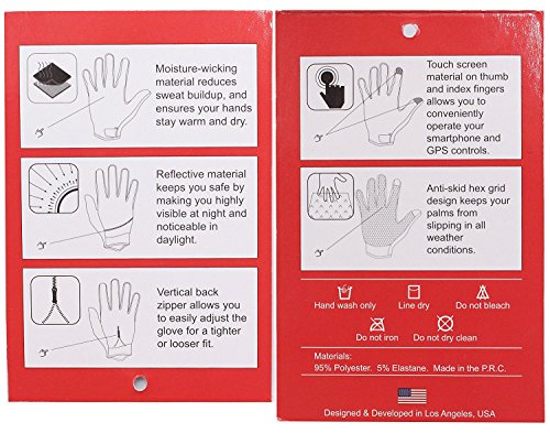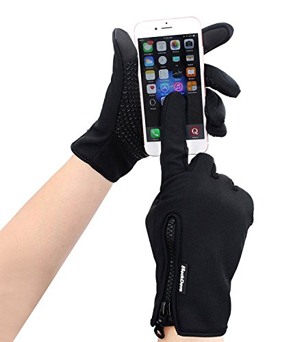 -. Feature : The perfect multi-purpose outdoor gloves for winter cycling, driving, tactical, shooting, biking, climbing, ranching, and general everyday use. Refer to the sizing guide on the left for best fit. / Back hand zipper offers both sleek style and convenient form-fitting, so you can get rid of excess bulk or tightness any time. Also helps trap heat inside the glove in cold weather. / Excellent warmth-dexterity balance offers your hand protection from wind and rain, without sacrificing mobility of your fingers or wrist. Touchscreen material on thumb and index fingers lets you conveniently operate your phone. Easily type out a quick message or zoom in/out on a map, even singlehandedly. / With excellent (14000) waterproof and breathability ratings, these versatile gloves will withstand most weather conditions by keeping out wind and rain, while remaining perfectly breathable to ventilate sweat and odor. Recommended for 32 degrees F or warmer; for colder temperatures, wear a glove warmer underneath. / Anti-skid hex-grid "honeycomb" palms add friction to your grip, like nanopillars on a tree frog's toe pads (minus the stickiness). Allows you to securely grab onto handlebars while cycling in the rain, or hang onto wet surfaces and rocks without slipping while hiking or climbing.