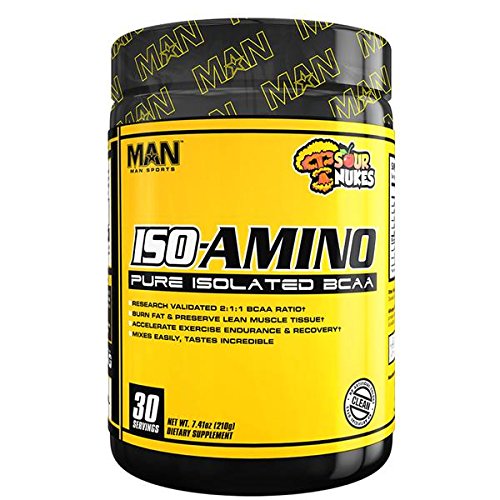 -. Binding : Health and Beauty -. Brand : Man Sports -. EAN : 0853360006799 -. Feature : Iso-Amino packs 5 grams of pure isolated BCAAs per serving in a scientifically proven 2:1:1 ratio / Iso-Amino can be taken throughout the day and is especially useful intra-workout to speed recovery -. IsAdultProduct : 0 -. Label : MANS SPORTS -. Manufacturer : MANS SPORTS -. Model : MAN1027/100/112 -. MPN : MAN1027/100/112 -. PackageQuantity : 1 -. PartNumber : MAN1027/100/112 -. ProductGroup : Health and Beauty -. ProductTypeName : HEALTH_PERSONAL_CARE -. Publisher : MANS SPORTS -. Studio : MANS SPORTS -. Title : MAN Sports 30/Servings Sour NUKES Iso-Amino, 7.41 Ounce -. UPC : 853360006799