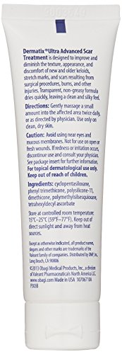 Studio : Dermatix Ultra Publisher : Dermatix Ultra Binding : Health and Beauty Product Description Dermatix ultra advanced scar treatment is a transparent, fast-drying silicone gel with unique qualities to make it ideally suited to help minimize or reduce signs and symptoms of abnormal scaring and aid in the development of hypertrophic scarring after surgery. Dermatix ultra is effective for the reduction of hypertrophic and keloid scars. It has also been successfully used for the treatment of scars resulting from trauma, burns and general surgical procedures. Dermatix ultra has been shown to flatten, soften and smooth scars, relieving itching and discomfort. Silicone gels have consistently been shown to be well tolerated and suitable for both children and adults. Dermatix ultra uses a new silicone technology that produces a film on the skin, providing skin protection in an esthetically acceptable manner, unique to other available scar gels. This new silicone technology imparts a soft silky feel to the skin, without any oily residue or buildup. Dermatix ultra can be used under makeup and clothing. 0