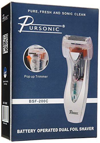 The Pursonic BSF200C CLEAR Battery Operated Shaver is the worlds smallest electric shaver, makes it easy and convenient to restore a freshly groomed appearance whenever and wherever you need to look your best. Thanks to its compact size and powered by 1 AA batteries it can easily be used at work, in the car, or even on short holiday trips. Don't want to shave just trim no problem, use the pop up trimmer on the shaver. The Pursonic Led Light indicates when the shaver is in motion. On/off Switch, cleaning brush, head cover for foil, user manual,1 year warranty.