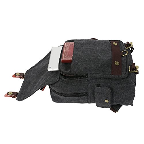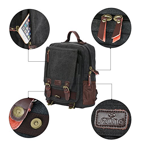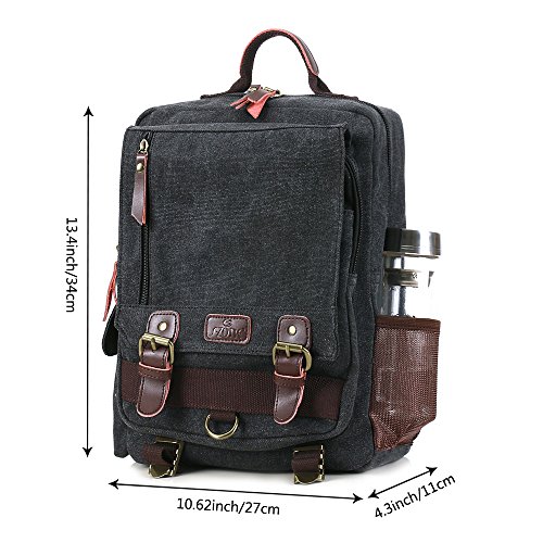 MULTI-COMPARTMENT: The canvas backpack is vintage and multifunctional with lots of pockets. 1 zipper pocket in the front flap; 1 zipper pocket and 1 open pocket under the flap; 2 side pockets. The main compartment is fitted with two zip heads and pulls: 1 inner zipper pocket; 1 inner laptop compartment; 2 inner small pockets. A small laptop, iPhone, wallet, snacks, tickets and magazine will all fit comfortably with room left over for add-ons.