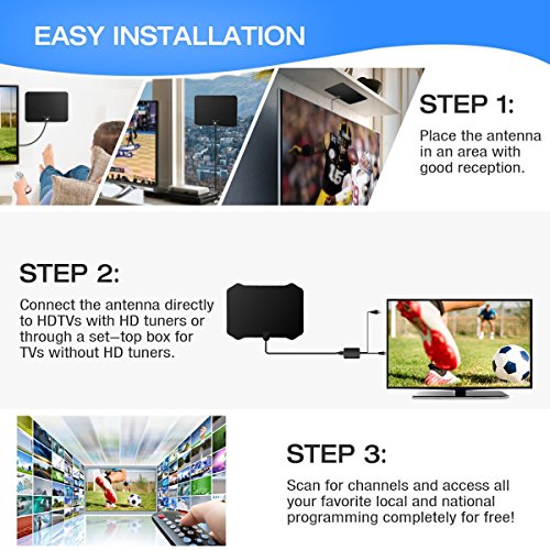 Note: 1. For Flatscreen HDTVs, check the TV's manual to make sure the TV has a built-in tuner for receiving over-the-air broadcast, If your TV has no built-in tuner, you can add an ATSC digital converter box to receive the HD signal. 2. Signal quality determines the picture quality and how many channels you can receive. Try moving it around your home to find the placement with the best signal. You might be surprised how many HD channel you can receive! 3. Antenna signal strength can vary depending on distance from the tower, terrain and weather. It is best for the antenna to be in line of sight with the TV tower(s) and avoid obstructions. Always re-scan for channels after moving the antenna. 4. This is an amplified antenna. If a signal cannot be received when using the external amplifier, remove the amplifier and try again. In some instances the amplifier may cause self-oscillation, which may interfere with signal reception.