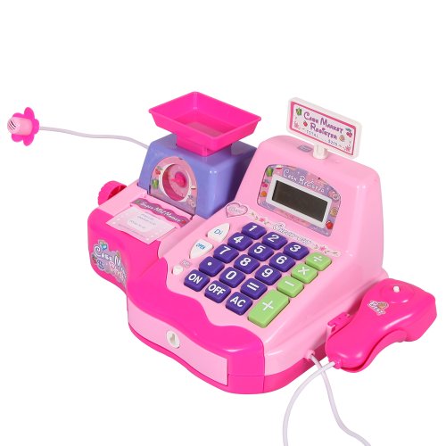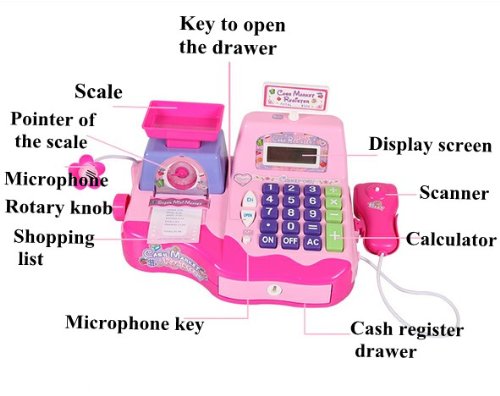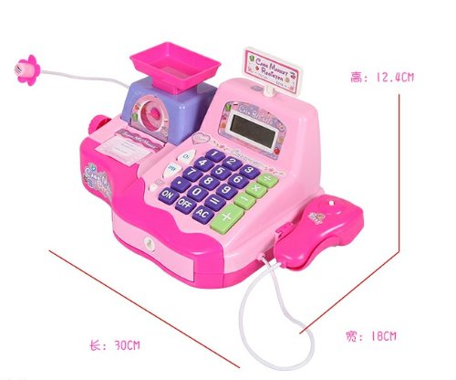 - Feature : Size of the product:31*19*14 cm,scientific design for kid. / Large LCD screen for sales totals,Voice amplified microphone.Cash drawer makes a ca-ching sound when opened / Inclued money,coins and supermaket items.Abundant toys for babies to play with their partners. / Simulation cash register with multiple functions,such as sound,scan,calculate and charge.It is very real and vivid. / Helping to develop children's overall abilities,oepration ability and coordination between eyes, hand and brain.