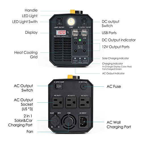 Portable rechargeable power supply and UPS 2 IN 1 ! The best ideal contingency companion either indoor or outdoor. It features: 500W UPS, 3 120V AC outlets, 4 USB charging ports up to 6.2A, 4 12V DC power ports up to 10A, 12V 26Ah / 288WH lithium rechargeable battery, Power Source with 4 USB, 4x12V DC and 3x110V AC Outlets,a solar / car input charging port. Intelligent CPU control mode, switch control for each output, LED display for battery power