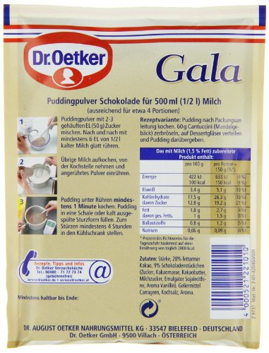 -. Binding : Lebensmittel & Getränke -. Brand : Dr. Oetker -. EAN : 4000521004286 -. Feature : Besonders Schokoladig / Gala - der feine Premium-Pudding / Dr. Oetker Gala sind die Premium-Puddinge von Dr. Oetker. Erlesene Zutaten garantieren den besonders guten Geschmack. Genau das Richtige zum Verwöhnen Ihrer Familie und Gäste. -. IsAdultProduct : 0 -. Label : Dr. Oetker -. Manufacturer : Dr. Oetker -. Model : 938478 -. MPN : 938478 -. NumberOfItems : 10 -. PackageQuantity : 1 -. PartNumber : 938478 -. ProductGroup : Grocery -. ProductTypeName : GROCERY -. Publisher : Dr. Oetker -. Studio : Dr. Oetker -. Title : Dr. Oetker Gala Pudding-Pulver Schokolade, 10er Pack (10 x 3 x 0.5 l Beutel)