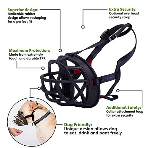 Details Brand:Mayerzon Material:strong but malleable Thermo Plastic Rubber and neoprene-lined Nylon Colors:Black Size Guide: # 1-Snout Circum- 5.5" to 8.2" Length- 2.3" to 3.1" # 2-Snout Circum- 6.7" to 10.2" Length- 2.7" to 3.5" # 3-Snout Circum- 7.8" to 12.2" Length- 3.1" to 3.9" # 4-Snout Circum- 9" to 13" Length- 3.5" to 4.3" # 5-Snout Circum- 11" to 14.9" Length- 3.9" to 4.7" # 6-Snout Circum- 12.6" to 17.3" Length- 4.7" to 5.5" Note: Measure your dog's snout from just below eyes to end of snout for length, and around the snout at the widest point for the circumference. Package Included:1 x Basket Muzzle