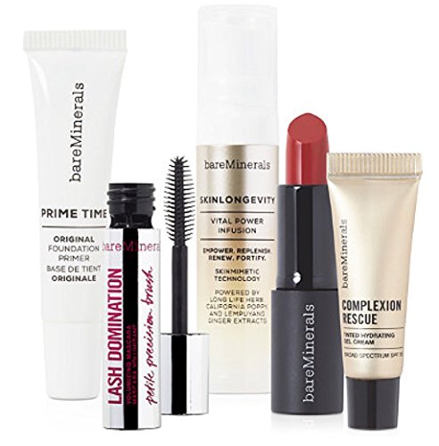 Bare Minerals travel set including vanilla complexion rescue tinted hydrating gel, prime time foundation, lash domination mascara, skinlongevity vital power infusion serum statment luxe shine lipstick sample in srsly red